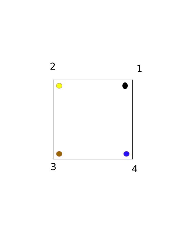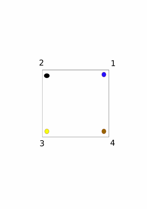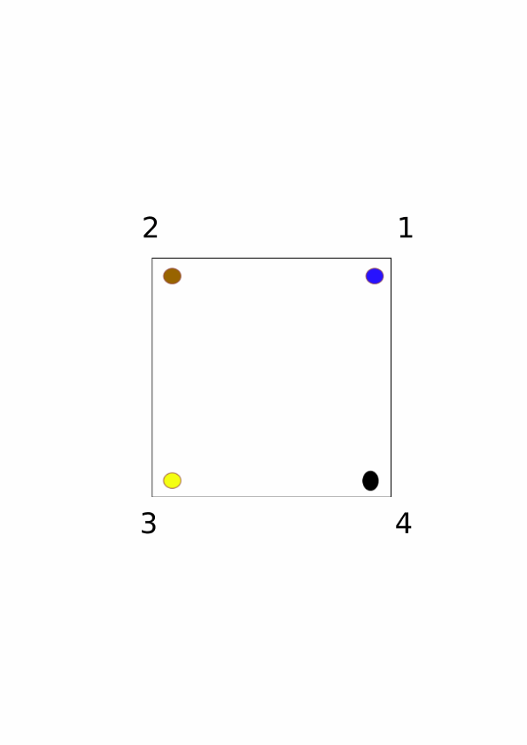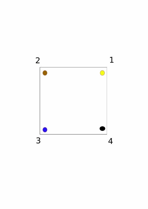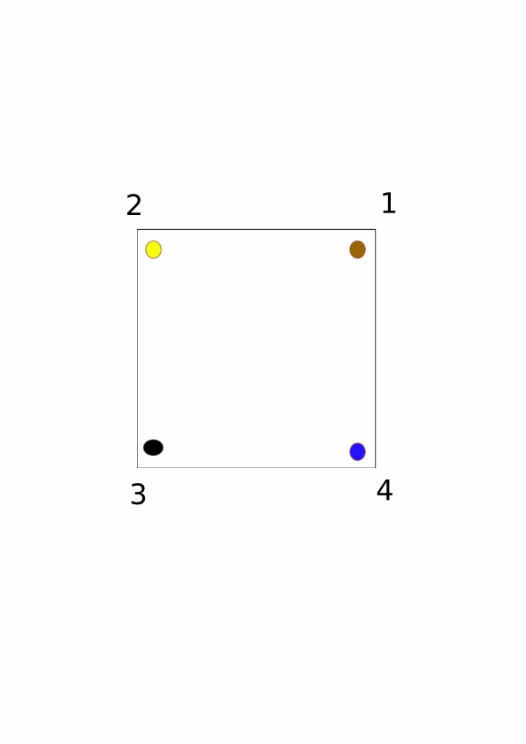 At the bottom of this lesson I’ve provided 8 images, numbered 1 through 8 (hence the distinction between “image” and “figure”, so that I can number these 1-8 as opposed to 3-10 when including the above figures). Each image contains a square that has four dots on it, each of a different color. We should think of the dots as being painted onto the square itself, and suppose the square is made of glass so that we can see the dots from both sides of the square (i.e., we can flip the square over and still see the dots). We should then think of the numbers 1, 2, 3, and 4 as being written on the coffee table (not the square), and therefore the numbers don’t move as we move the square around. The dots are just there to help us follow how the square moves, and the numbers are written on the table just so that we can specify how to move the square.